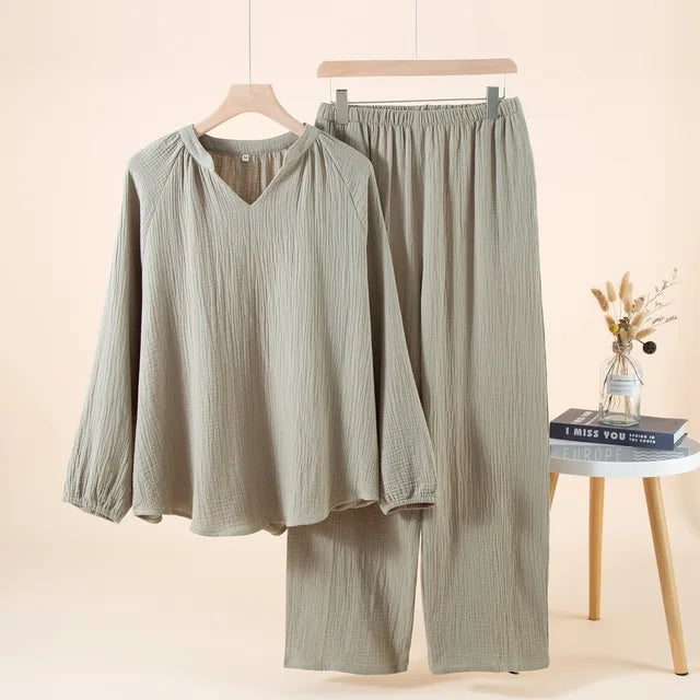 Wrap yourself in all-season comfort and understated style with our Long Sleeve Cotton Pajama Set. Designed for your most restful hours, this two-piece ensemble is made from breathable, lightweight pure cotton, offering a supremely soft feel against your skin. The classic long-sleeve top and full-length pants provide cozy, modest coverage, perfect for cool evenings or lounging. With a relaxed fit, clean lines, and a selection of sophisticated solid colors, this set blends timeless comfort with simple elegance for the ultimate at-home retreat.